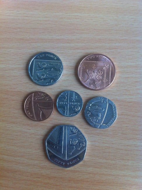 العملات المعدنية البريطانية تشكّل شكل معطف الجيش الخاص بالدولة.