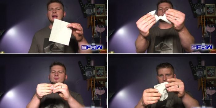 خدعة عودة الورق بعد تمزيقه تتم عن طريق إحضار قطعتين من الورق ومن ثم يقوم بكمش الورقة الأولى دائرياً وإخفائها خلف أحد أطراف الورقة الثانية ثم بعد ذلك يقوم الساحر بقطع الورقة الثانية طولياً وهذا ما يراه الجمهور، ويستعمل خفة يده في أن يكمش الورقة التي قد مزقها ولكن بشكل لا يجعلها تلتف حول الورقة الثانية وتكمن الخدعة في أنه يتظاهر بأنه يخرج ولاعة من أحد جيوبه وفي هذا الوقت يتخلص من الورقة التي مزقها ثم يخدع الناس بأن الولاعة هي التي أعادت الورقة لسيرتها الأولى.