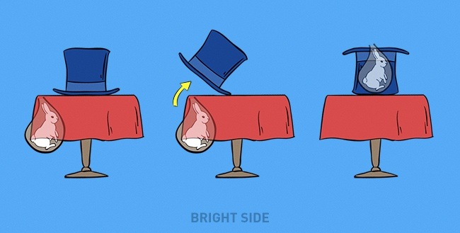 هذا هو سر اختفاء الأرنب من القبعة وظهوره فيها مرة أخرى، فبعد أن يوهم الحضور بأن القبعة فارغة يضع الأرنب بخفة يد فيها.