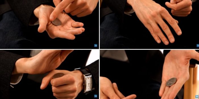 السر في العملة المعدنية التي تختفي من اليد وتظهر مرة أخرى هو خفة اليد حيث أنه يظهر يده وهي فارغة ثم يضع العملة أسفل إبهام اليد الأخرى ويمررها من فوق يده اليُسرى فتظهر للحضور على أن العملة قد ظهرت فجأة ويندهش الجميع.