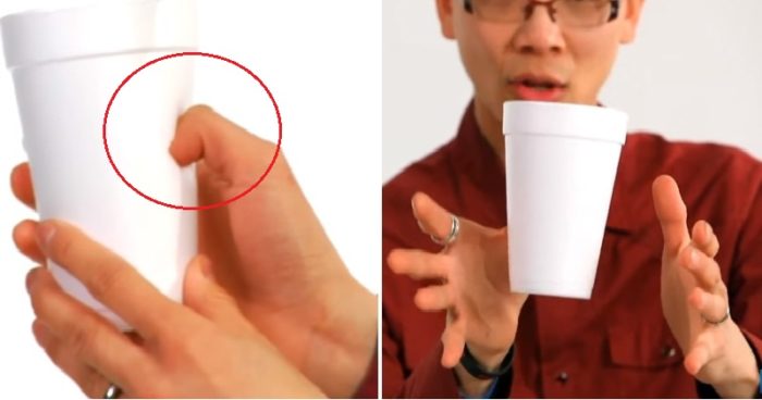 خدعة الكوب الطائر تعتمد على عدم رؤية الجمهور للزاوية التي يرى منها الساحر، حيث إنه يثقب الكوب ويضع إصبعه ويثبته في الكوب ولكن من الزاوية التي يرى منها الجمهور سيظن أن الكوب يحلق في الهواء.