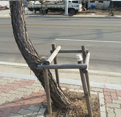 إما أن الشجرة قد نمت بعد وضع السياج واتخذت هذا المسار الغريب أو أن من وضع هذا السياج أراد أن يريح نفسه من عناء التفكير ووضع السياج حول قاعدة الشجرة مقنعاً نفسه أنه بذلك قد قام بعمله على أكمل وجه!