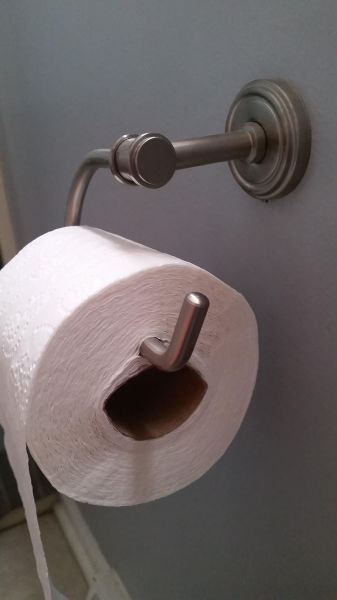 يوجد فتحة كبيرة جداً لإدخال حامل المناديل، ومع ذلك أصر هذا الشخص على استخدام هذه الطريقة المثيرة للسخرية لكي يعلق بكرة المناديل بهذا الشكل العجيب!
