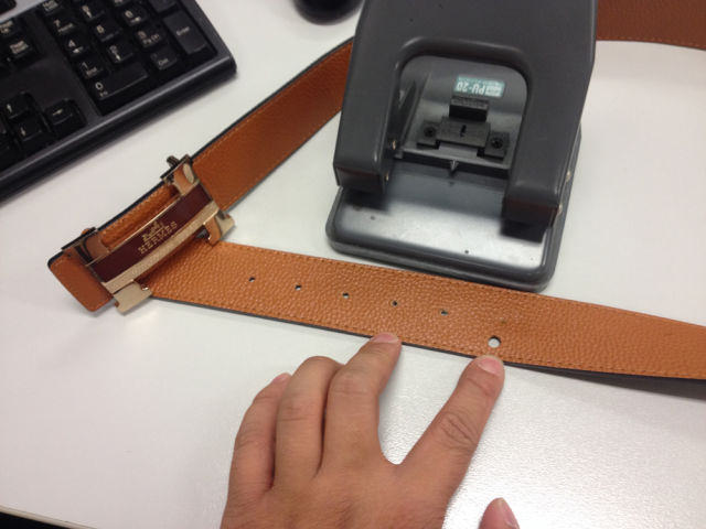 مبروك، لقد اشتريت حزاماً، لكن يا للأسف اتضح أنه ضيق، لا مشكلة سأقوم بصنع فتحة بنفسي. لكن انظروا، الفتحة بعيدة جداً عن المكان المخصص لها! من الأفضل أن أشتري حزاماً جديداً.