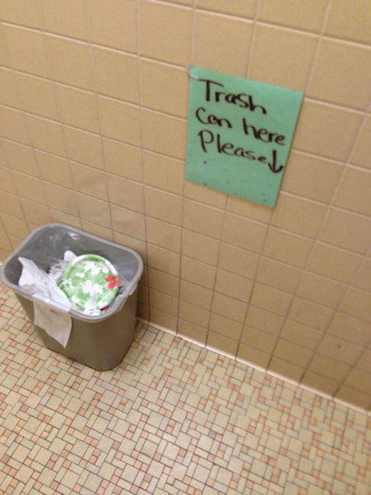 هذه اللافتة تقول ضع سلة القمامة هنا من فضلك، ومع ذلك وضعها العامل بعيداً عن اللافتة!