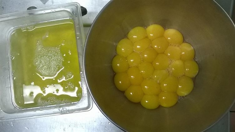 6- صفار البيض المتبقي بعد إزالة بياض البيض هذا موضوع بشكل مثالي ليبدو كأن البيضة عبارة عن صفار فقط دون البياض.