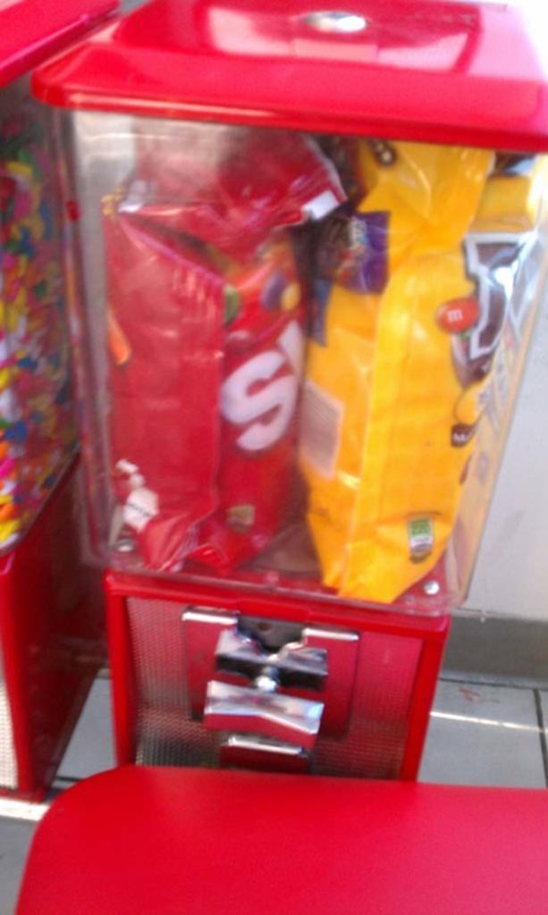 6- في العادة تكون هذه الماكينات تحتوي على حبات الحلوى لكي يمكن لها أن تنزل للشخص الذي يضغط ليأخذ واحدة، لكن الموظف أراد أن يريح نفسه ووضع أكياء الحلوى كما هي في الصندوق!